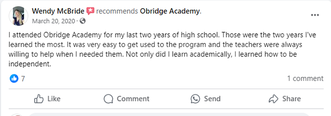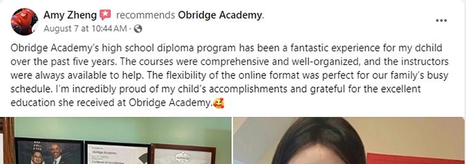 Obridge Academy combines all the benefits of a traditional private school with the flexibility of self-paced distance learning. The Obridge Academy difference is in the relationships that students cultivate with teachers, school counselors, admissions coordinators, and peers. We emphasize one-on-one mentoring with our students and fully prepare them for their future in university-level academics. We do not tire in our effort to provide an outstanding record of helping students to enter the college of their choice.